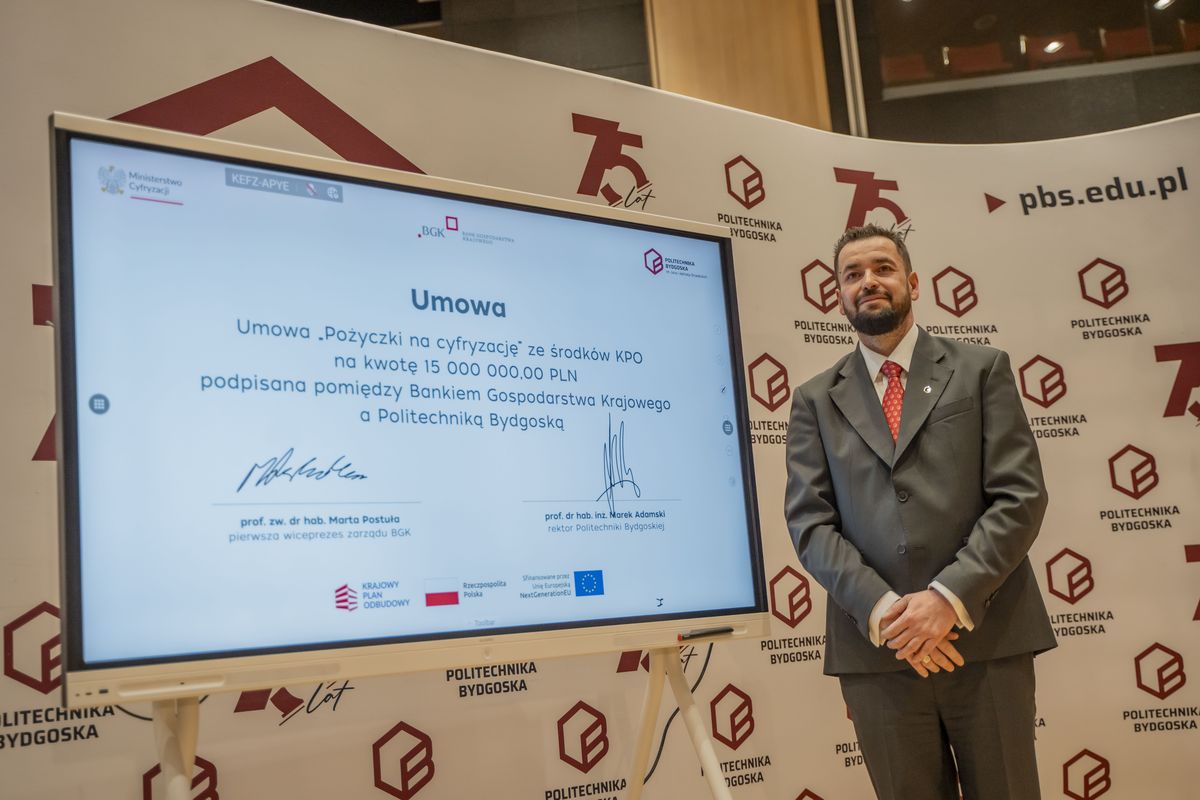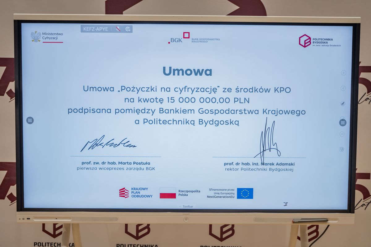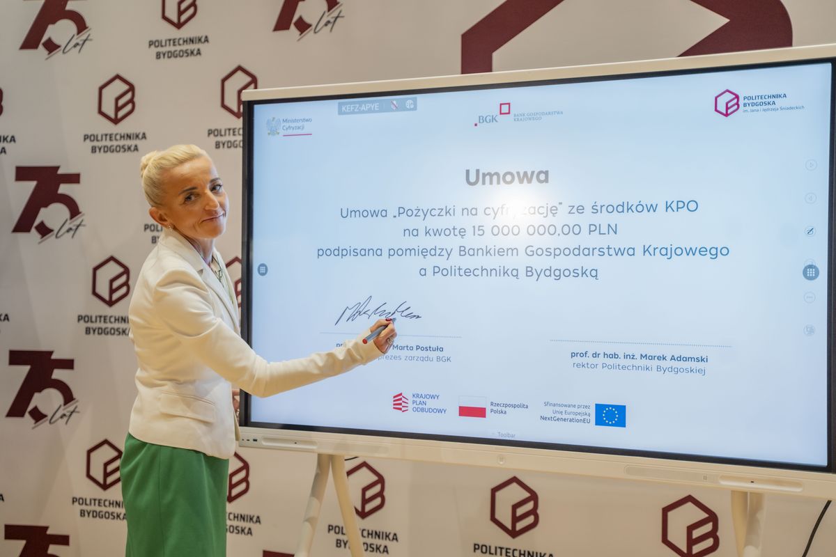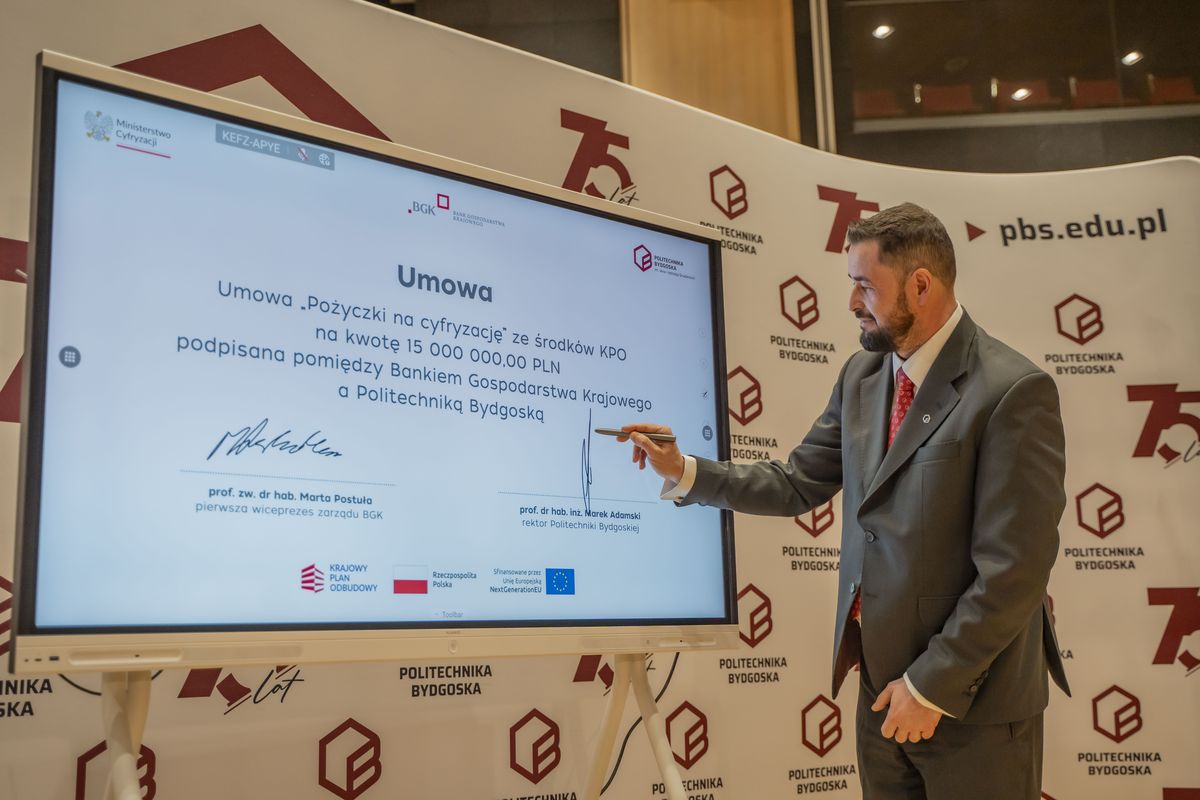 Bank Gospodarstwa Krajowego podpisał z Politechniką Bydgoską umowę pożyczki na cyfryzację ze środków Krajowego Planu Odbudowy i Zwiększania Odporności (KPO) na kwotę 15 mln zł. Dzięki finansowaniu uczelnia kupi nowoczesne serwery do pracy nad sztuczną inteligencją, uruchomi własne centrum monitorowania cyberbezpieczeństwa oraz zmodernizuje serwerownię i sieć. W wydarzeniu wziął udział wiceprezes Rady Ministrów i minister cyfryzacji, Krzysztof Gawkowski. Podpisy na umowie złożyli pierwsza wiceprezes zarządu BGK, prof. zw. dr hab. Marta Postuła oraz rektor Politechniki Bydgoskiej, prof. dr hab. inż. Marek Adamski.