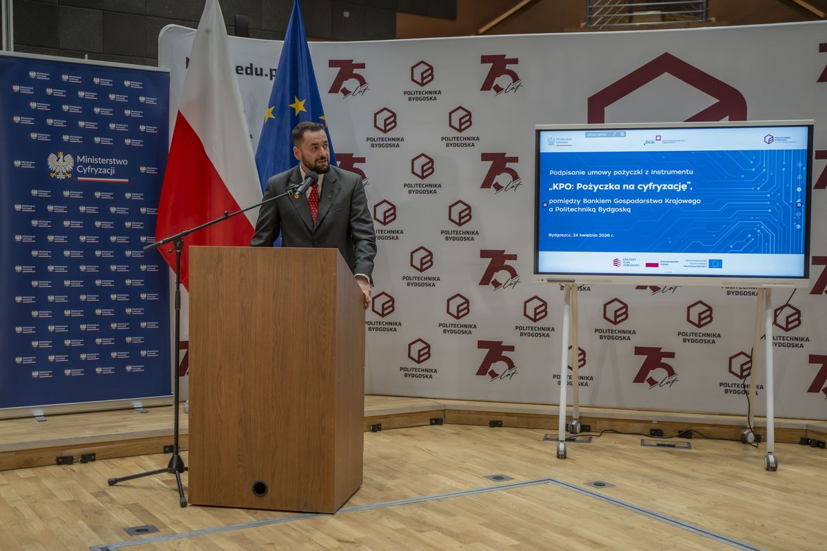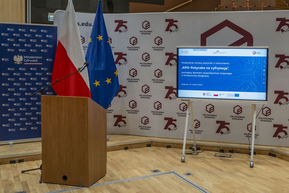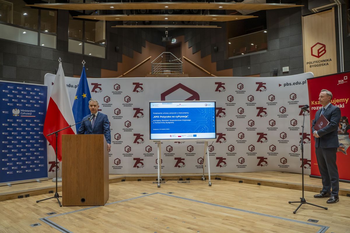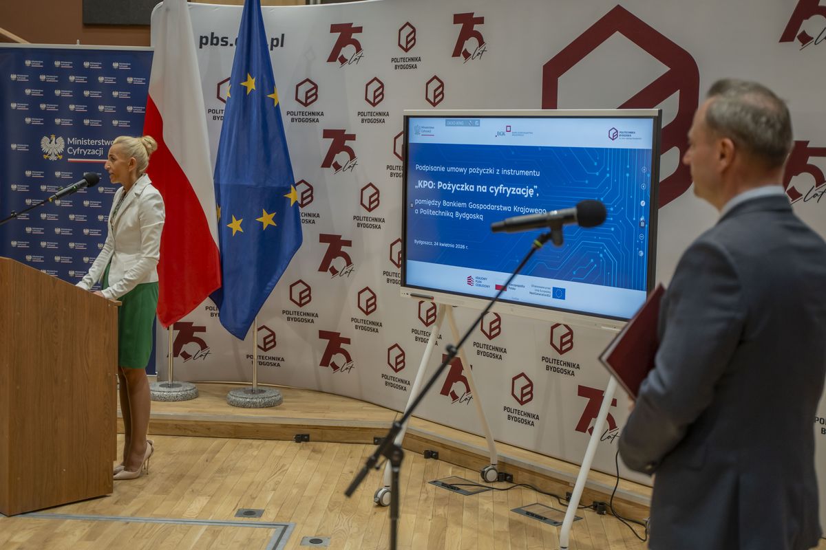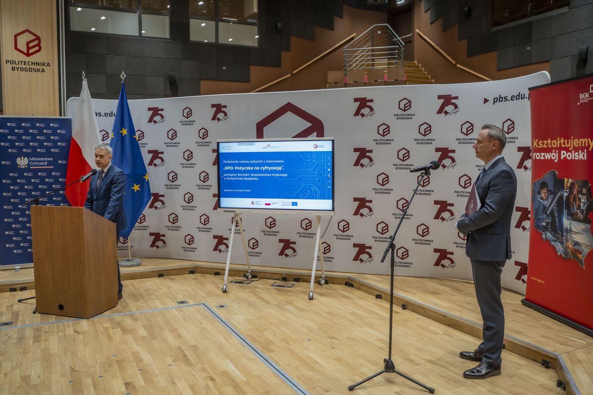 Bank Gospodarstwa Krajowego podpisał z Politechniką Bydgoską umowę pożyczki na cyfryzację ze środków Krajowego Planu Odbudowy i Zwiększania Odporności (KPO) na kwotę 15 mln zł. Dzięki finansowaniu uczelnia kupi nowoczesne serwery do pracy nad sztuczną inteligencją, uruchomi własne centrum monitorowania cyberbezpieczeństwa oraz zmodernizuje serwerownię i sieć. W wydarzeniu wziął udział wiceprezes Rady Ministrów i minister cyfryzacji, Krzysztof Gawkowski. Podpisy na umowie złożyli pierwsza wiceprezes zarządu BGK, prof. zw. dr hab. Marta Postuła oraz rektor Politechniki Bydgoskiej, prof. dr hab. inż. Marek Adamski.