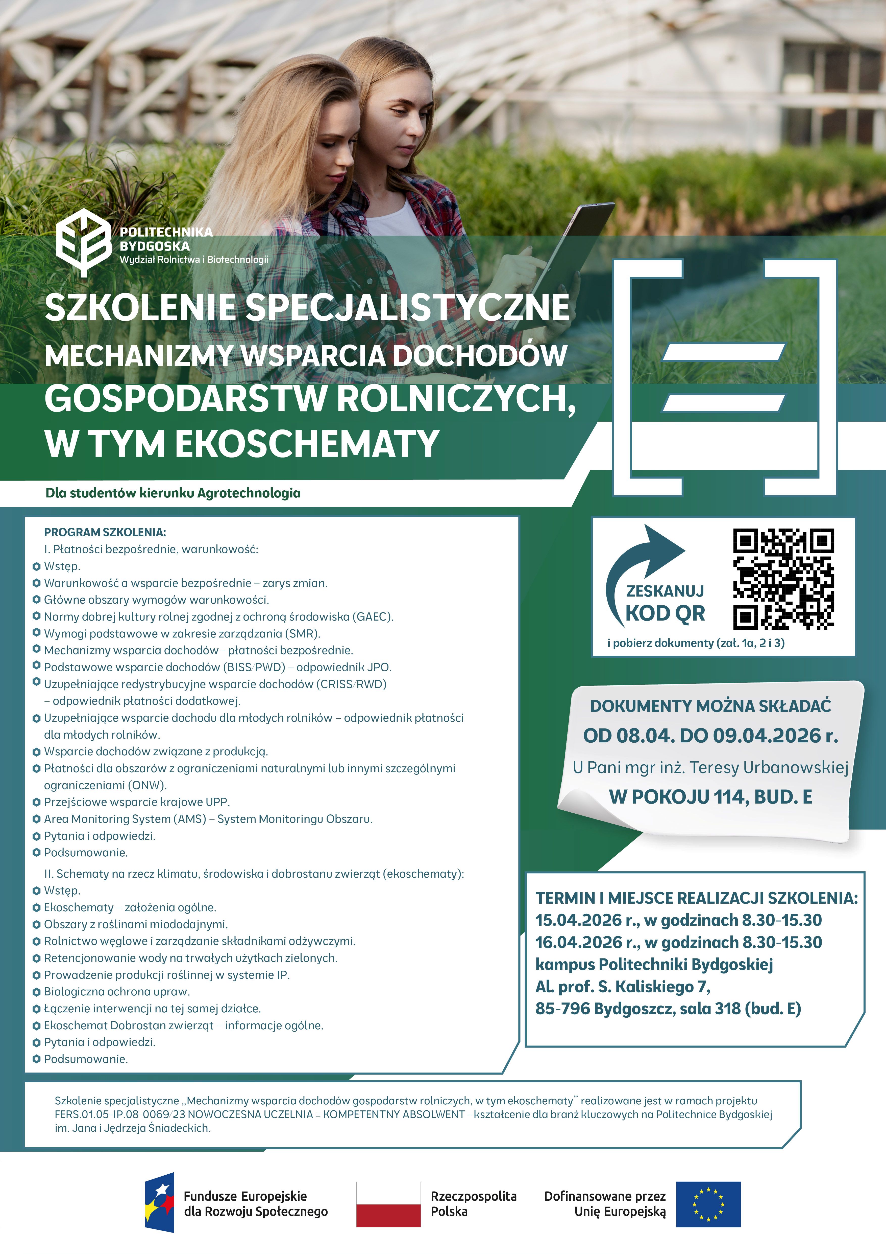 Zapraszamy do zapisów na szkolenie „Mechanizmy wsparcia dochodów gospodarstw rolniczych, w tym ekoschematy” realizowane w ramach projektu FERS.01.05-IP.08-0069/23 NOWOCZESNA UCZELNIA = KOMPETENTNY ABSOLWENT - kształcenie dla branż kluczowych na Politechnice Bydgoskiej im. Jana i Jędrzeja Śniadeckich. Szkolenie przeznaczone jest dla studentów kierunku Agrotechnologia.