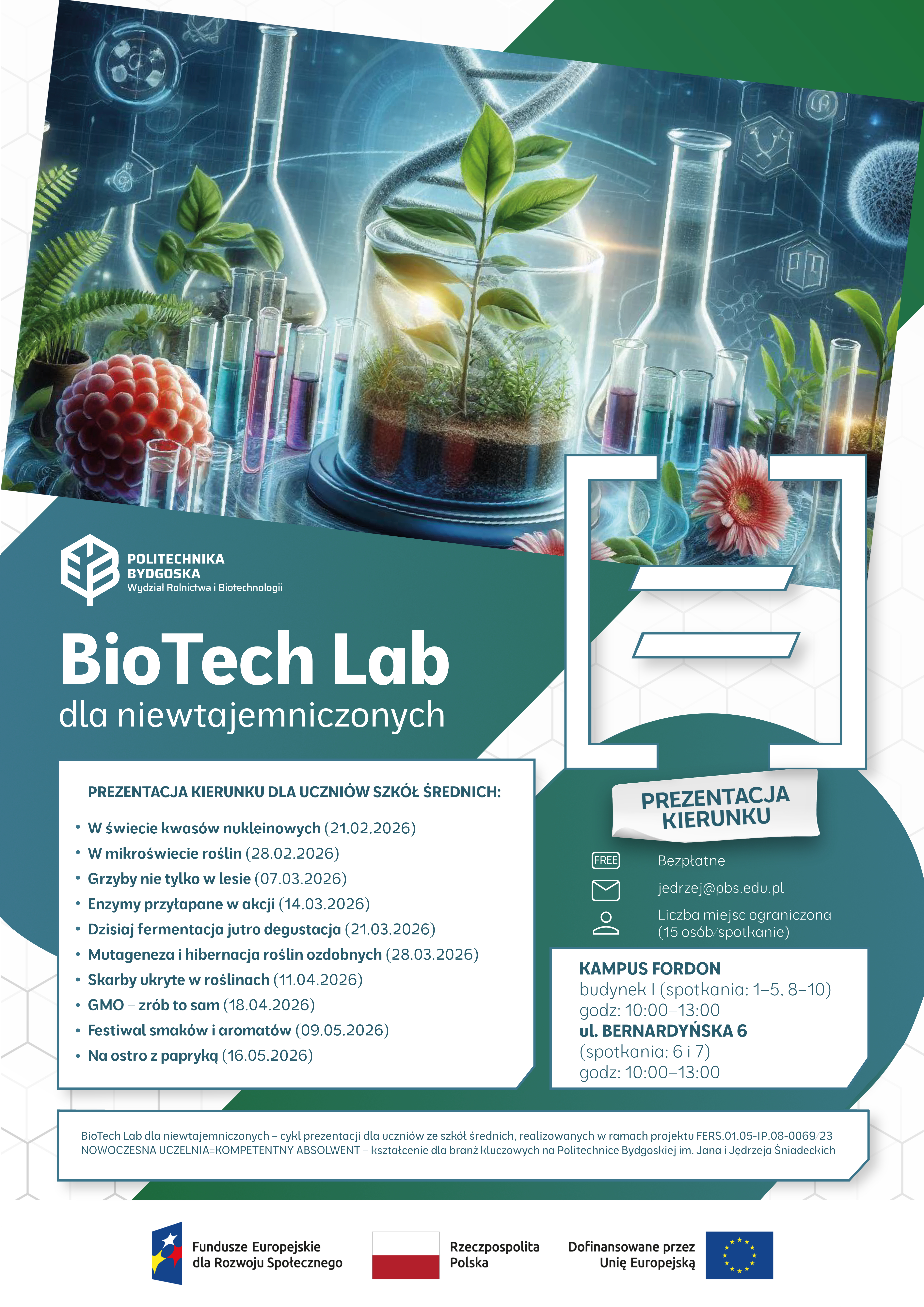 Prezentacje adresowane są do uczniów szkół średnich, którzy chcieliby popracować w laboratorium i zapoznać się z różnymi, ciekawymi aspektami biotechnologii. Zajęcia odbywają się w soboty, od godz. 10.00 do 13.00 - spotkania 1-5 oraz 8-10 w kampusie Politechniki Bydgoskiej w Fordonie (Al. Prof. S. Kaliskiego 7, bud. I, sala 035), natomiast spotkania 6 i 7 na ul. Bernardyńskiej 6.